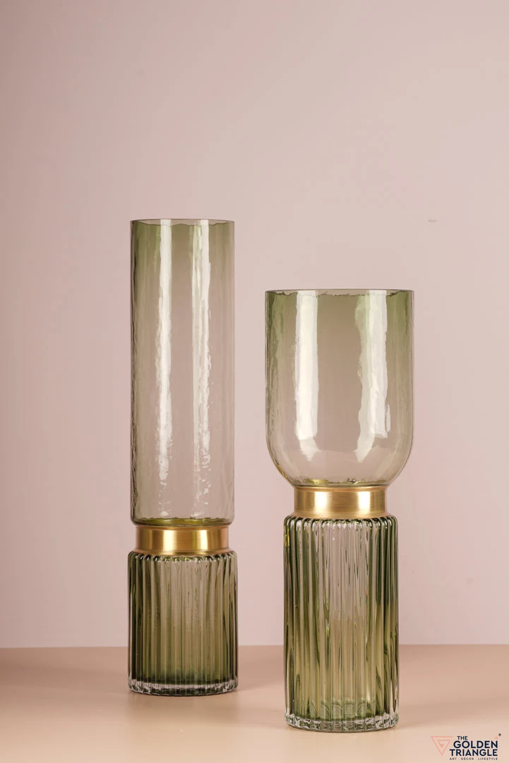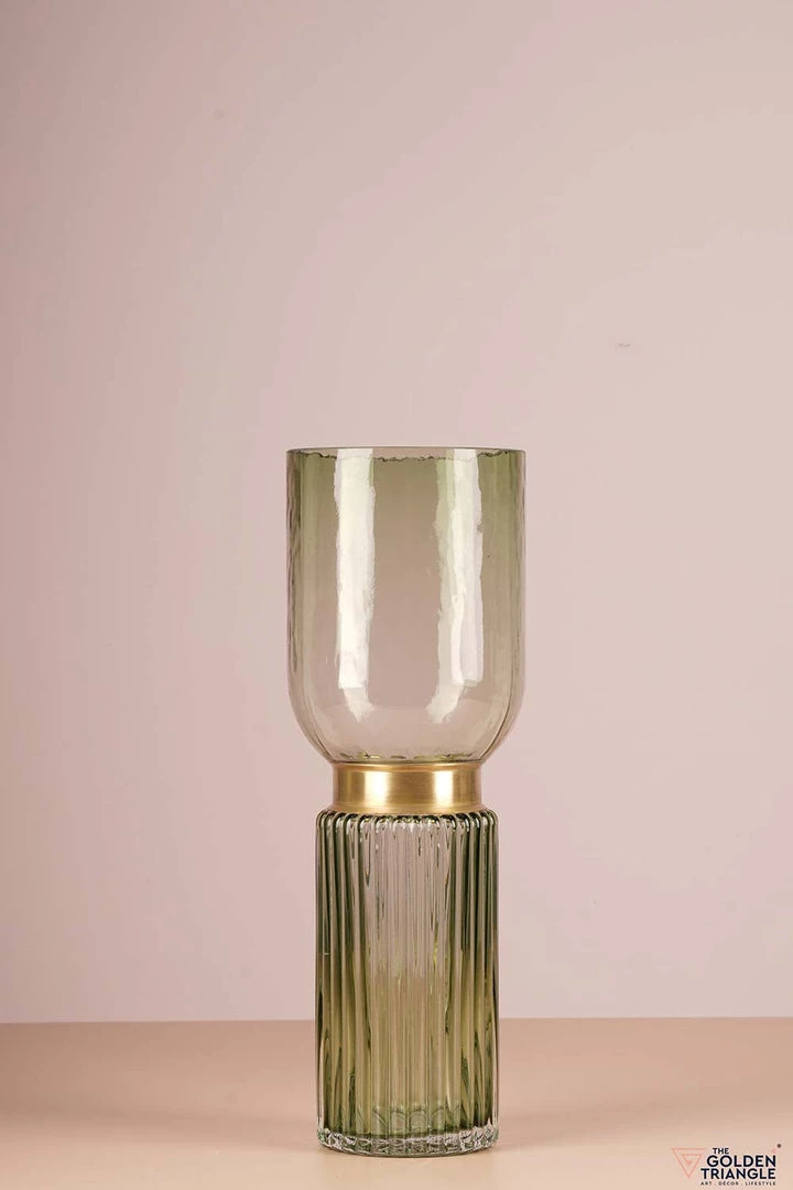 This tall glass vase with a gold metal band is crafted with a rippled bottom and a cylindrical top that will make your fresh flowers look stunning.