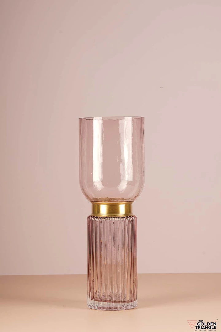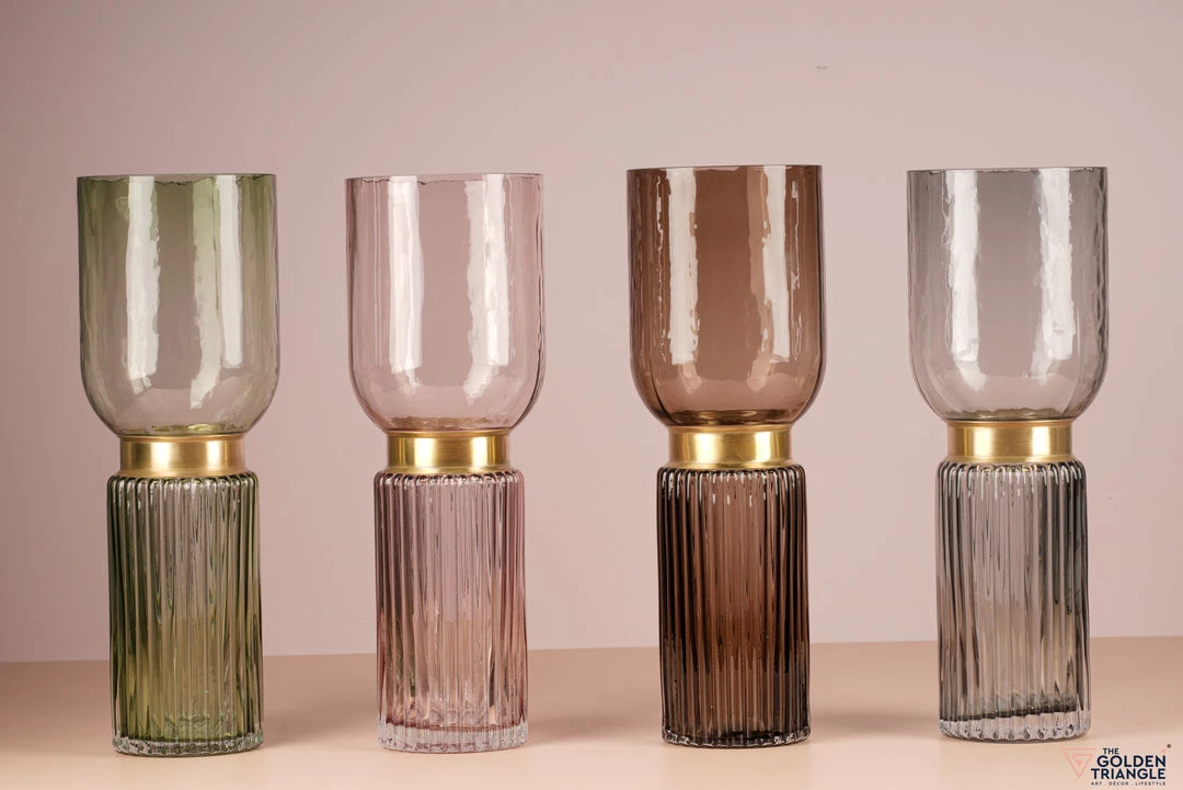 This tall glass vase with a gold metal band is crafted with a rippled bottom and a cylindrical top that will make your fresh flowers look stunning.