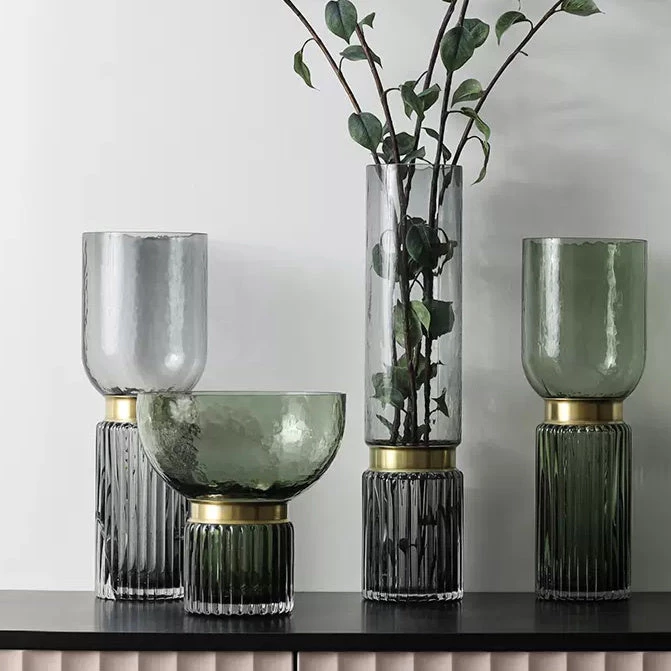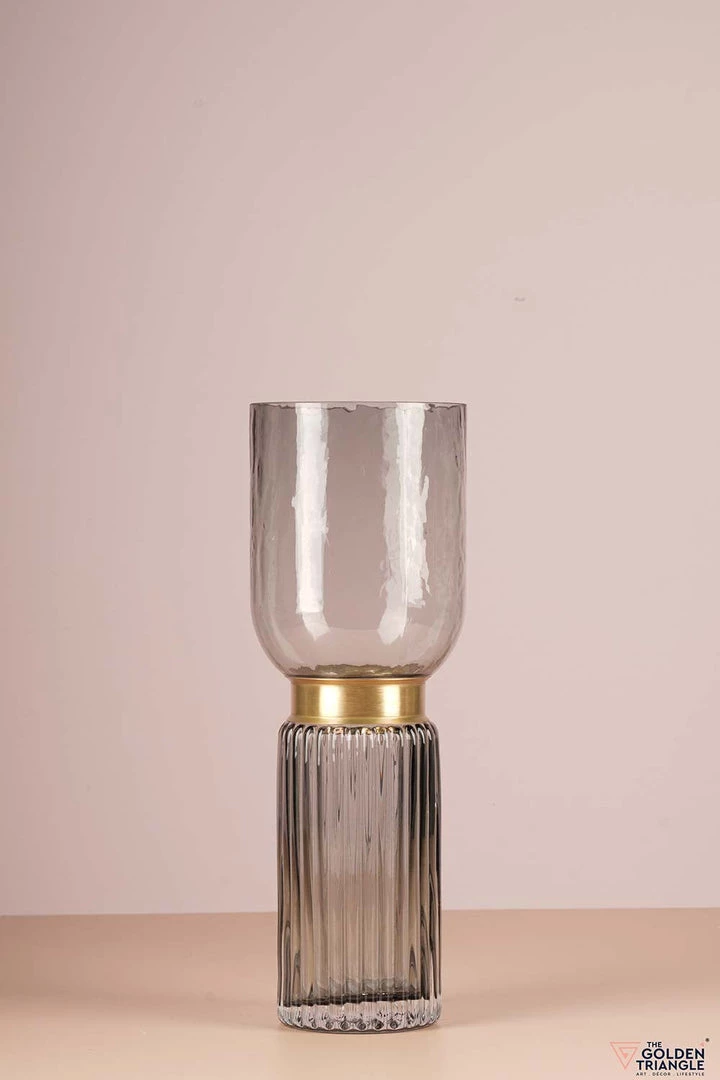 This tall glass vase with a gold metal band is crafted with a rippled bottom and a cylindrical top that will make your fresh flowers look stunning.