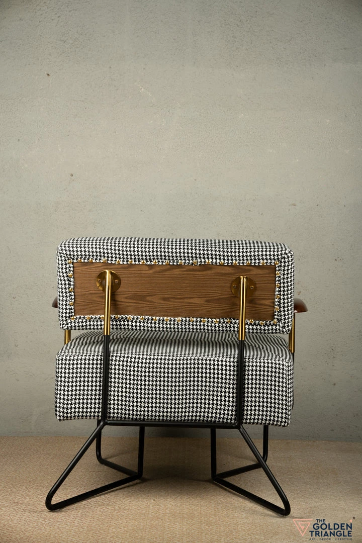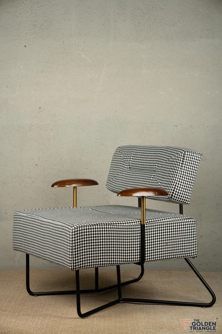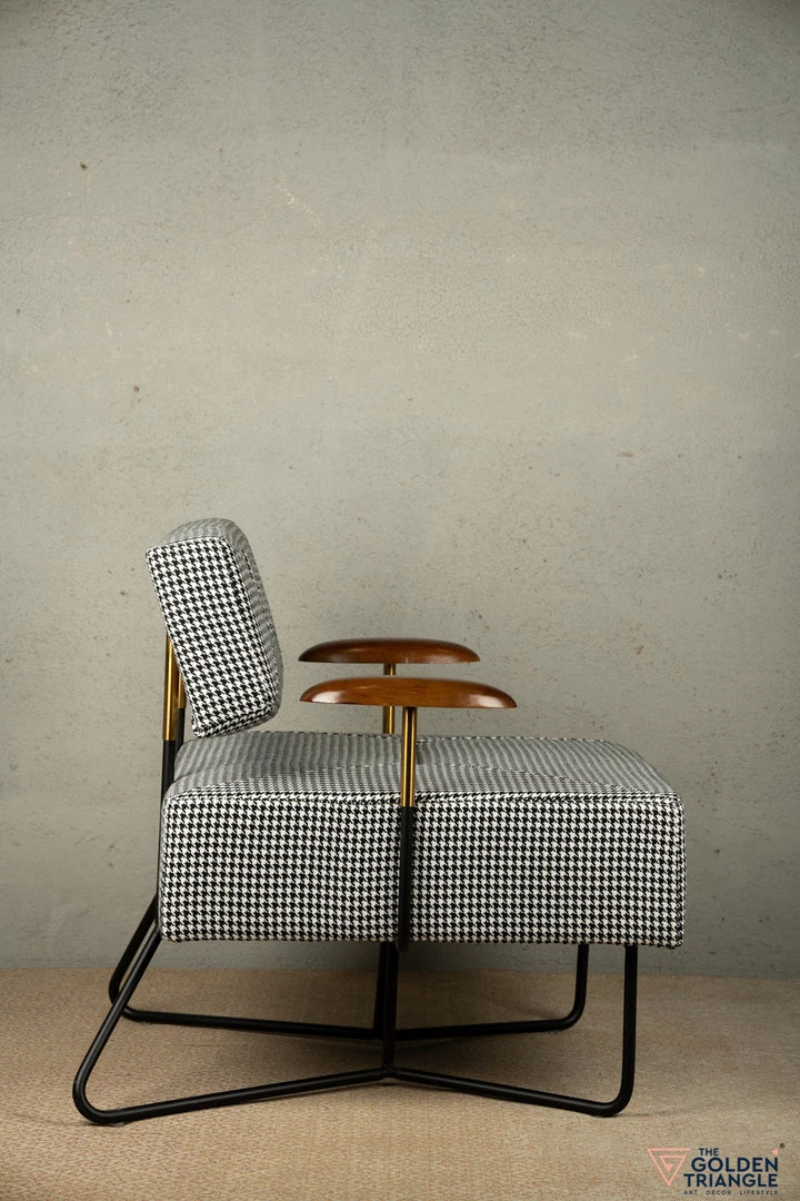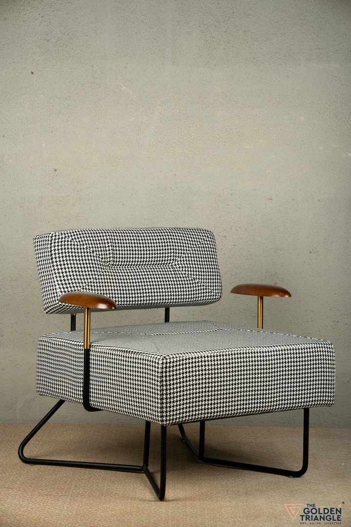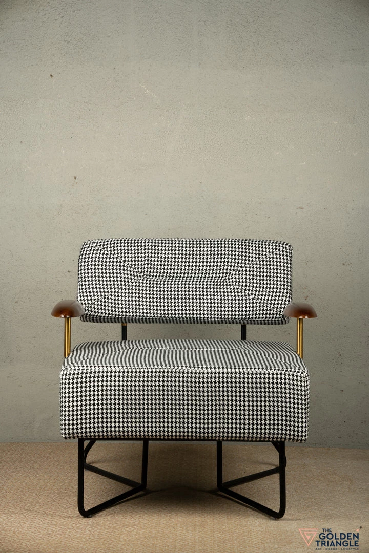 Class meets sleek craftsmanship! This chic checkered and fabric upholstered wonder is thickly cushioned and thoughtfully designed. It has brown wooden armrests, black metal legs and an overall silhouette that is meant for the prim and proper.