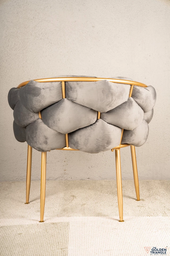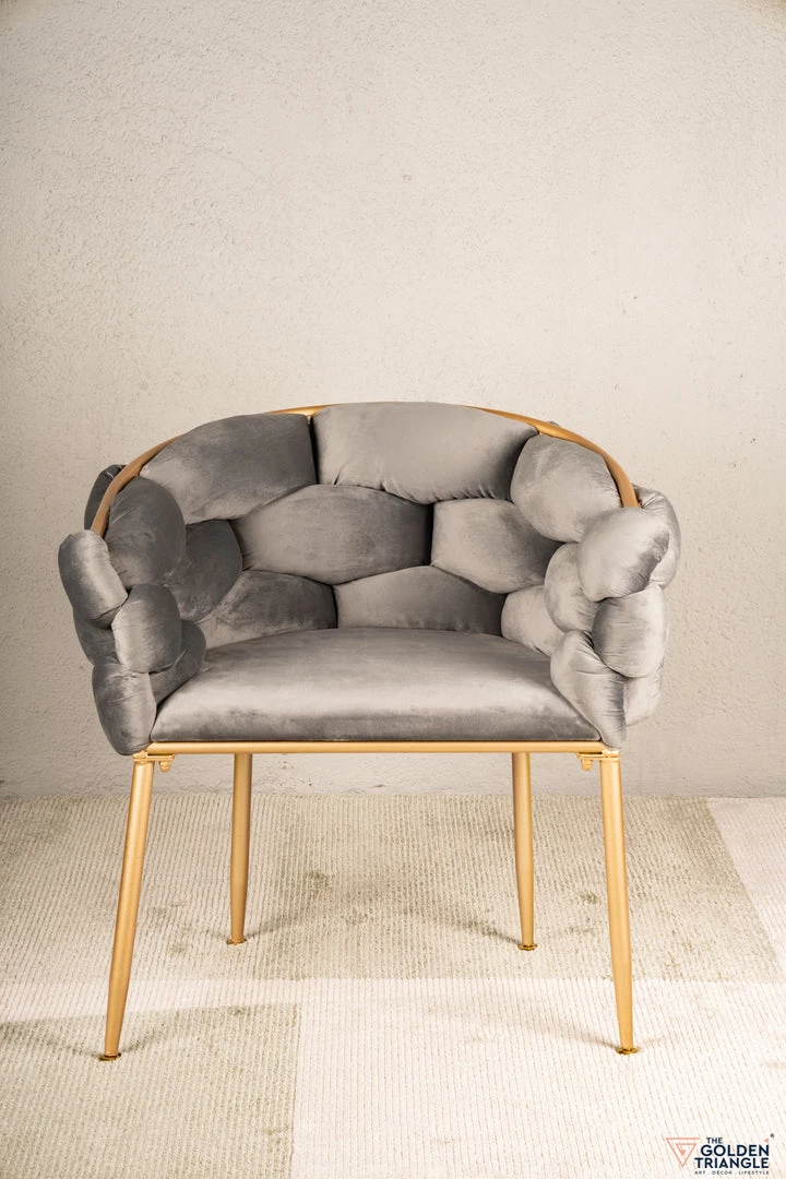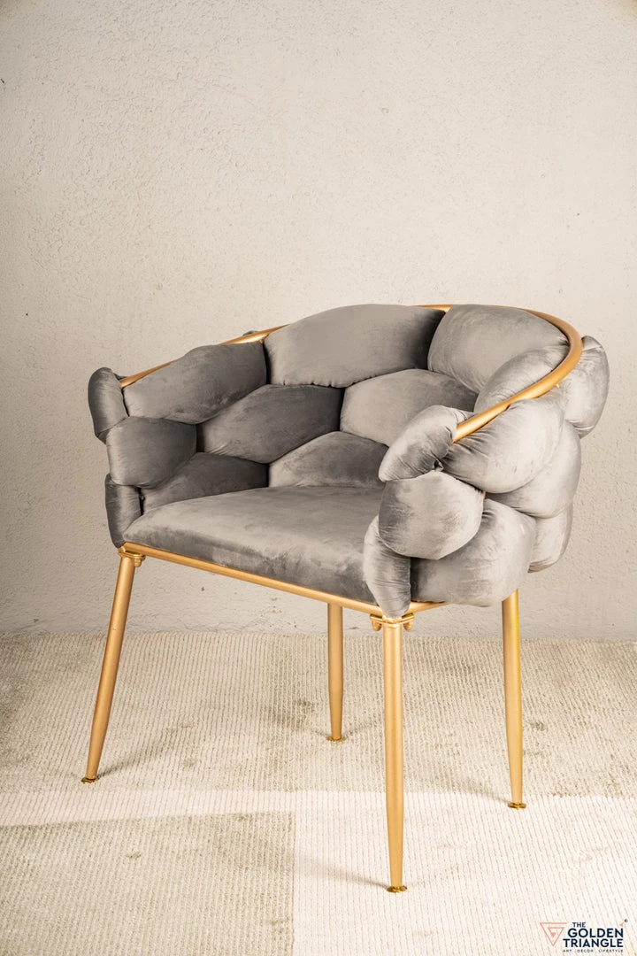 This chair is a beautiful way to accessorise your home. Upholstered in Suede, it brings a sleek style to your décor while giving it a stylish touch. The thick tufted backrest offers plenty of comfort along with deep cushioning making it a relaxing chair to sit in. Supported by a gold metal frame, it adds elegance and strength. Make this eye catching chair a statement in your den.