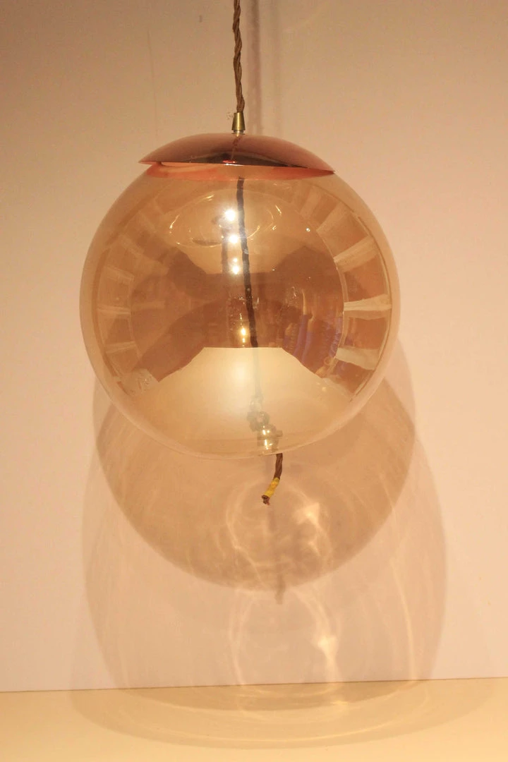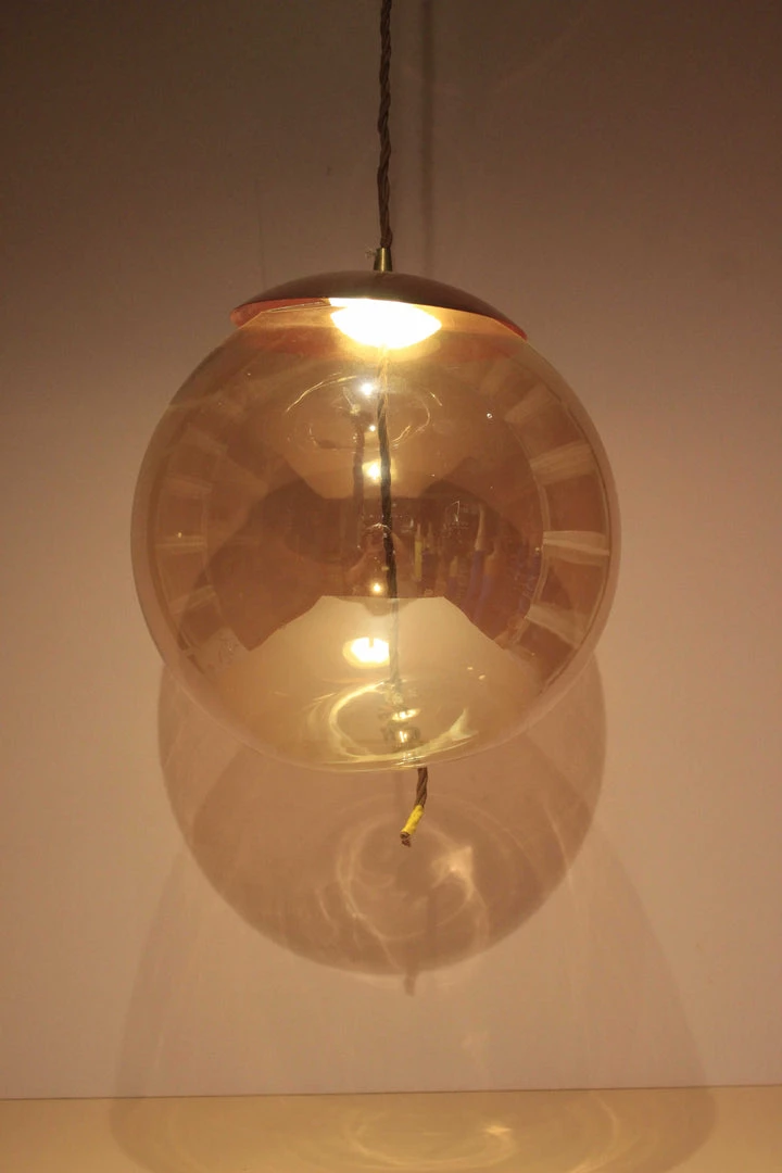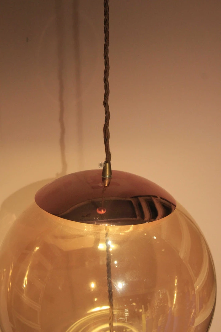 A charmingly transparent globe of light in amber. This lovely hanging light will bring a celestial aura to any interiors.