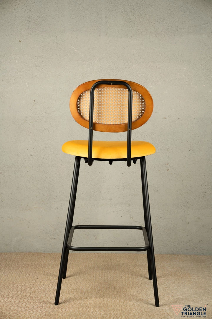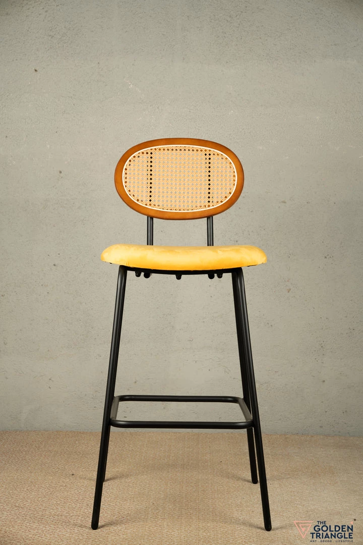 A Contemporary twist to your modern Bar chair with this Rattan Back and Cushioned Seat. This lightweight construction and open weave design creates an eye catching piece that instantly brings an elegant trendy vibe to your living space. Handcrafted in synthetic Rattan with black metal legs. This Bar Stool is perfect for an exclusive ambience for your kitchen island or Bar area