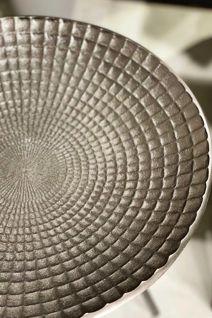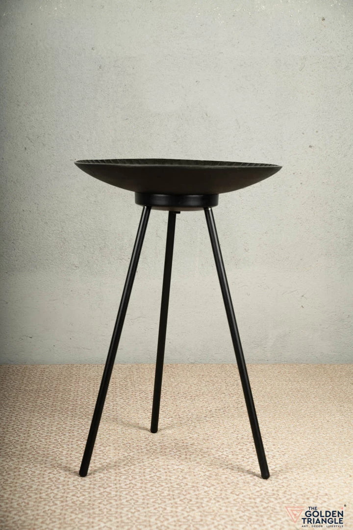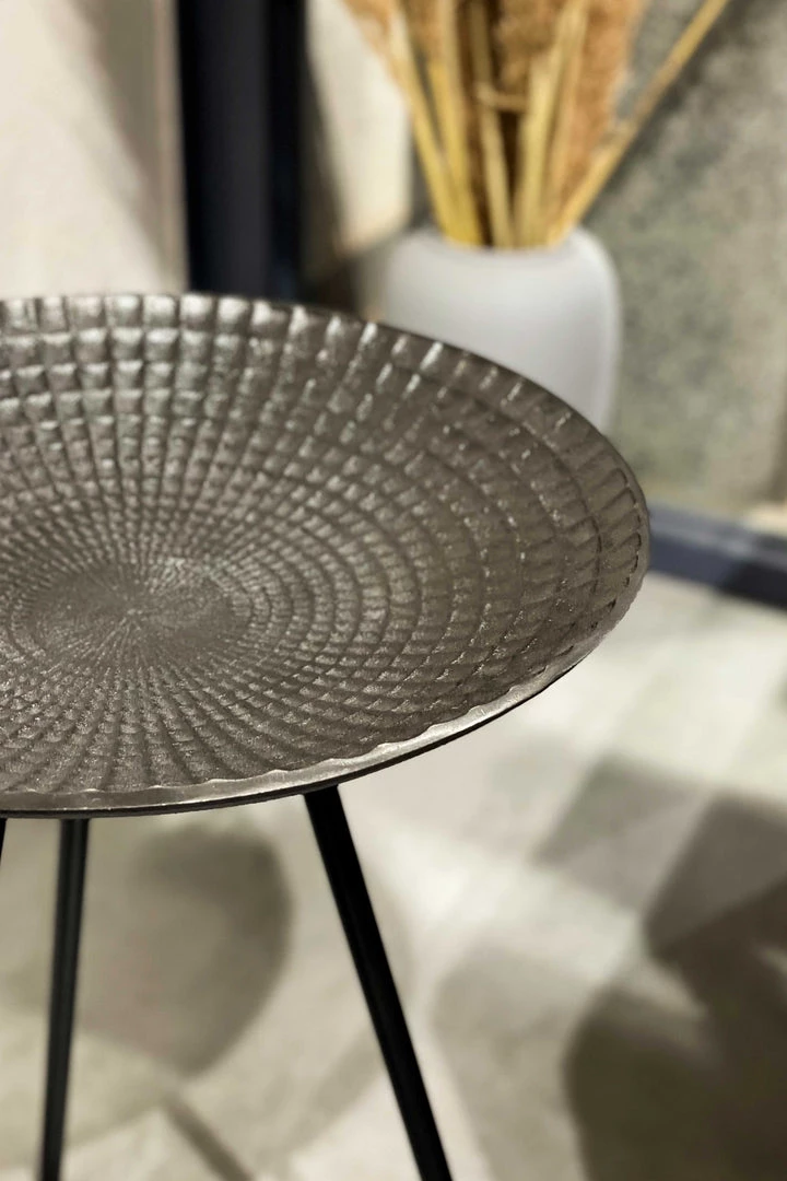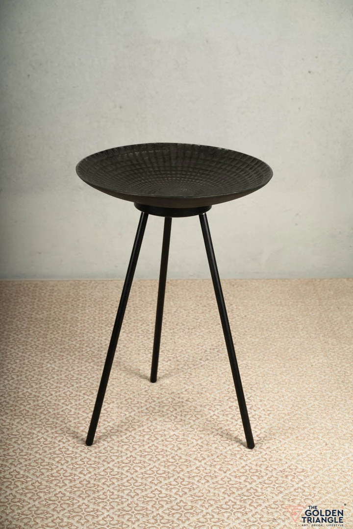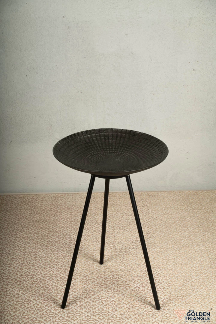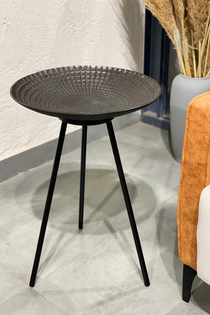 Shaped like a deep-plate, this unique side table flaunts a lovely texture and has re-imagined tripod-style legs that make it a modern yet classic piece of furniture.