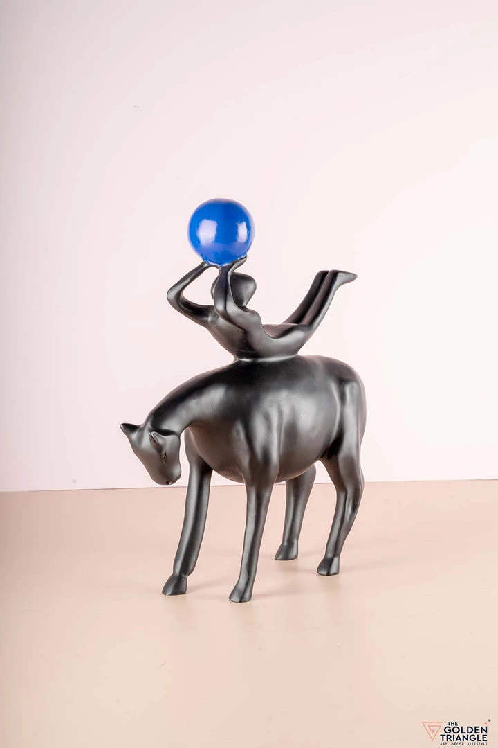 A gorgeous dark horse with a gymnast and metallic blue ball will make for a stunning centerpiece for your consoles and tabletops.