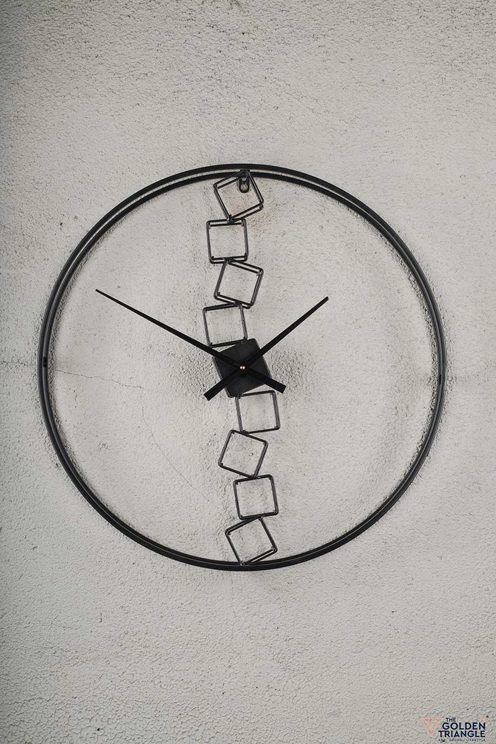 The beauty of geometry on a large black metal-ringed wall clock with tiny metal cube details and slender hands.