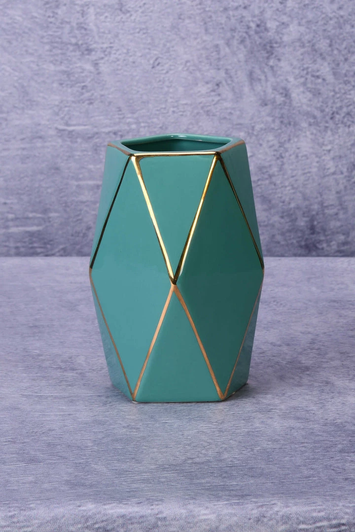 A geometrically crafted turquoise ceramic vase for your petite blooms and stems. Owing to its vivid hue and design, this vase can be used as a solo accent piece.