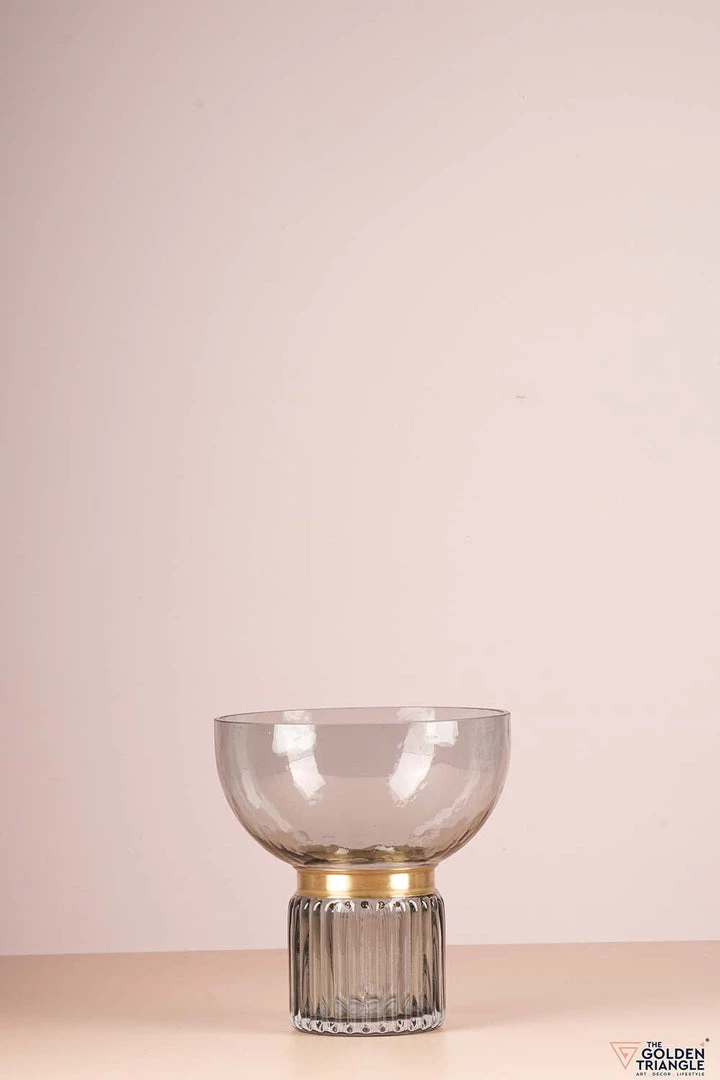 This glass vase with a gold metal band is crafted with a rippled bottom and a curvaceous top that is an elegant piece on its own.